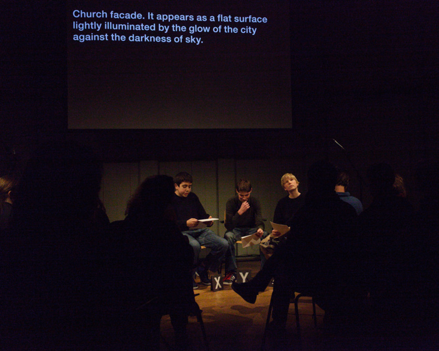 Het licht wordt gedempt in het Anatomicum en bij gebrek aan beeld spits ik mijn oren. Door het geluid van hakken die een trap opstijgen word ik me bewust van het gebouw zelf, van de ruimte waar we ons in bevinden. Buiten mijn zicht komt iemand hijgend de zaal binnenlopen. Een dame laat keelklanken horen waarin ik een echo van de 'Ursonate' van Kurt Schwitters meen te herkennen: