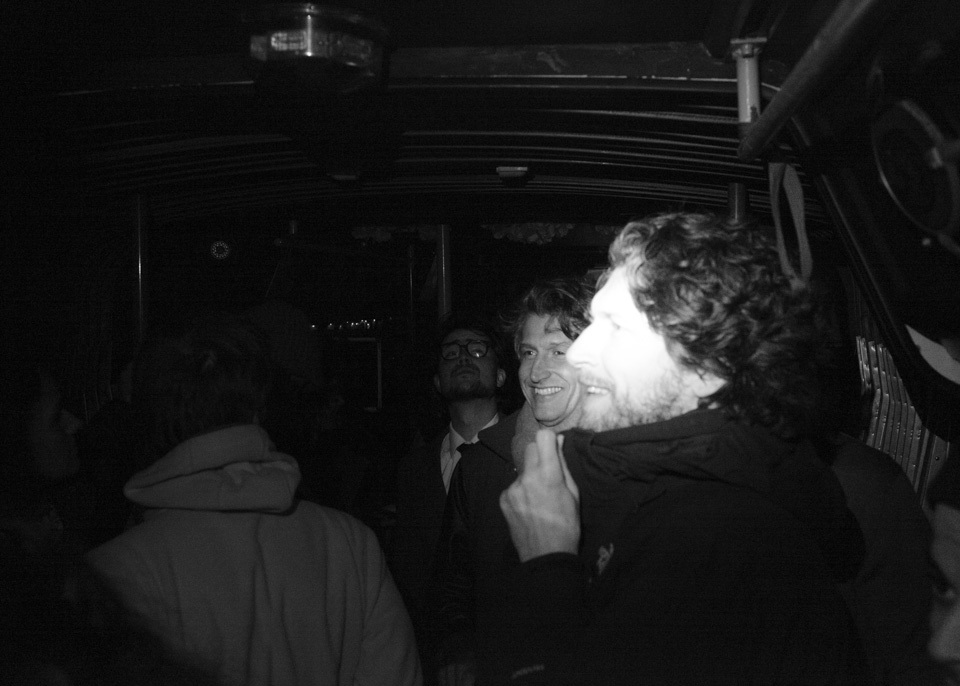 De passagiers, de kunstenaars, de curatoren, deze hele avond. Wij horen niet in een Flügelbus, zoals die mensen op dat bankstel niet in een lampenwinkel hoorden. Maar we zijn er, dus misschien horen we er toch. Hoor ik er toch.