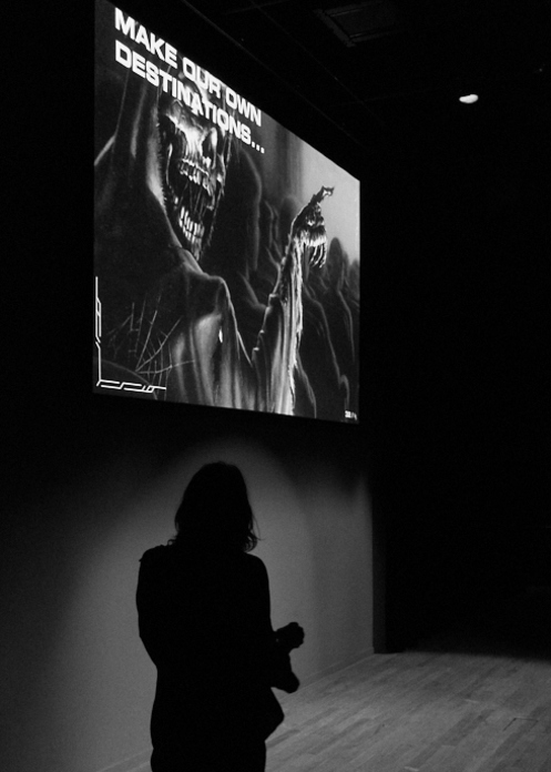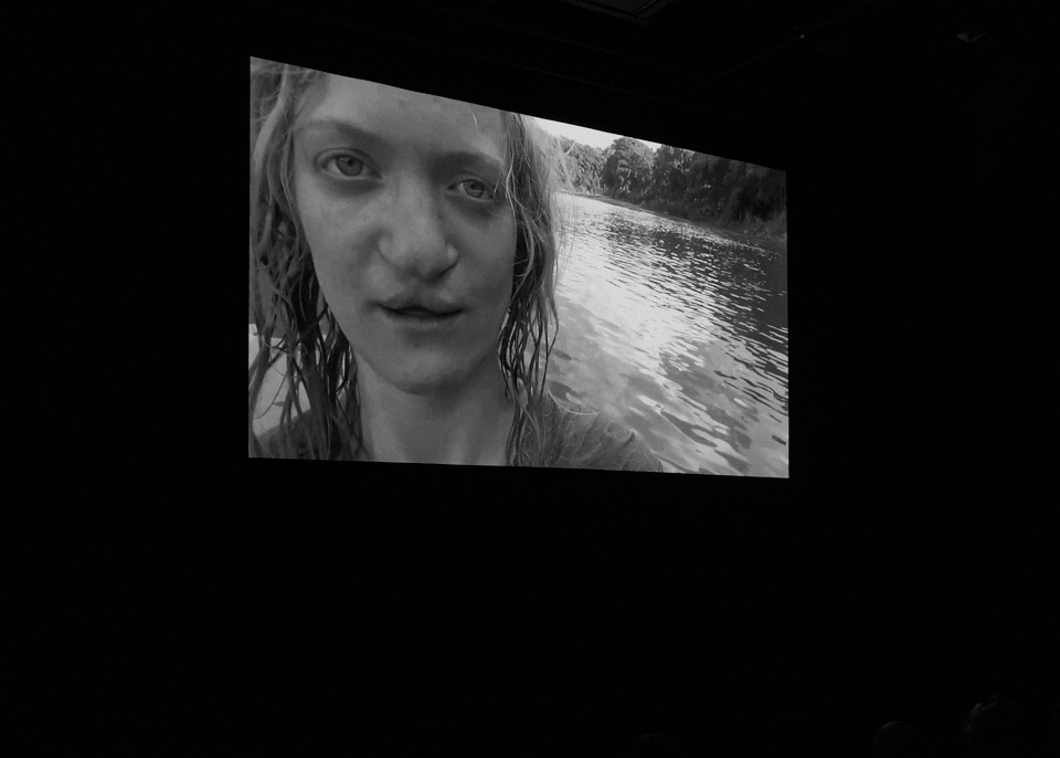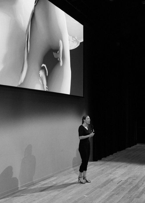 Na het eten beklim ik de trappen naar boven, waar op het balkon voor de zaal DJ AGGAton al op hoog volume aan het draaien is: Nightcore. Later legt hij me uit wat het is, met een intense blik, alsof hij in mij een instant liefhebber herkent: 'Zoek het maar op! Het zijn eigenlijk normale tracks, maar dan veel sneller afgespeeld.' In de zaal zitten al een aantal bezoekers, op de drie rijen stoelen rondom een groot scherm. Het lijkt bijna een scene uit een David Lynch-film, door de hoge donkere gordijnen langs de wand. Op het scherm zijn langzaam bewegende beelden te zien, van verf op een naakt lichaam, zou je kunnen denken als je niet goed kijkt. Het is een zinnelijke abstracte animatie van Elsemarijn Bruys, waarvan ik al een still zag op de uitnodiging.